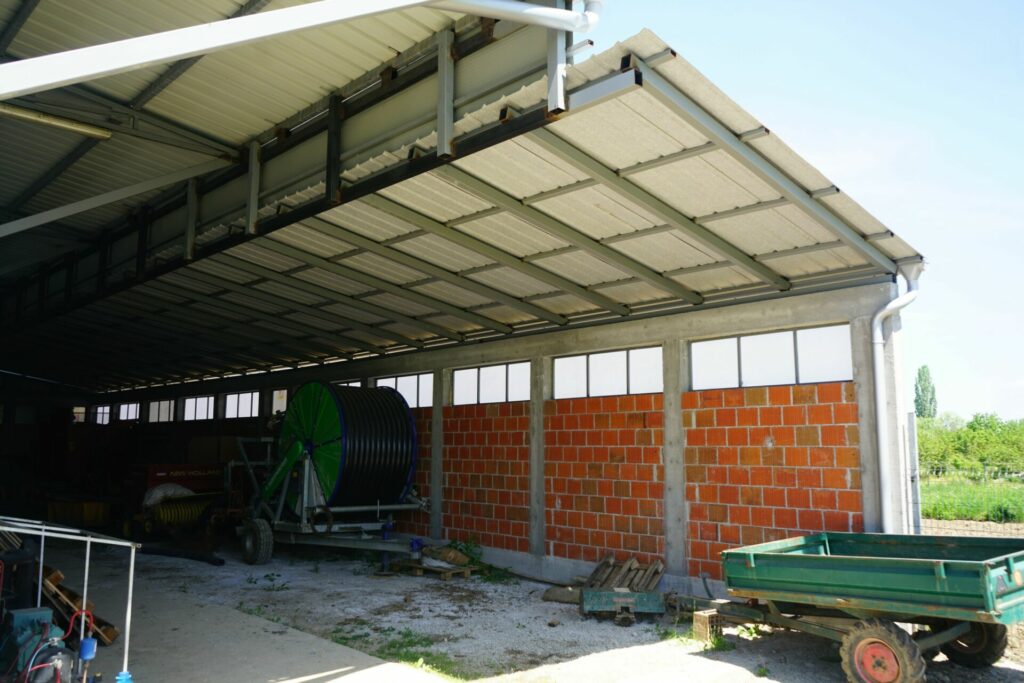 Ce qui impressionne lorsqu’on se rend au complexe agricole de Solidarité Kosovo, outre l’activité agricole diverse et foisonnante, ce sont les engins agricoles en nombre et pour certains de taille imposante. Il s’agit de tracteurs, de moissonneuses, de faucheuses, d’outils de semis, de pulvérisation, d’engins de manutention, etc. Cette précieuse pépinière était exposée aux aléas des conditions climatiques. Afin de loger et de protéger le matériel agricole, Solidarité Kosovo a entrepris la construction  d’un hangar métallique sûr et accessible de 125m².