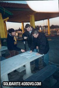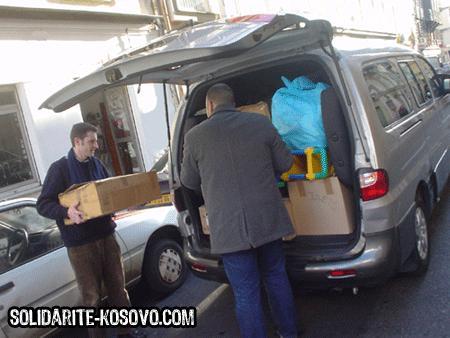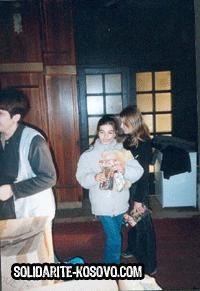 Première mission de la toute jeune association Solidarité Kosovo. Jouets et vêtements chauds sont distribués aux enfants réfugiés du village serbe d’Obilic rasé quelques mois plus tôt.