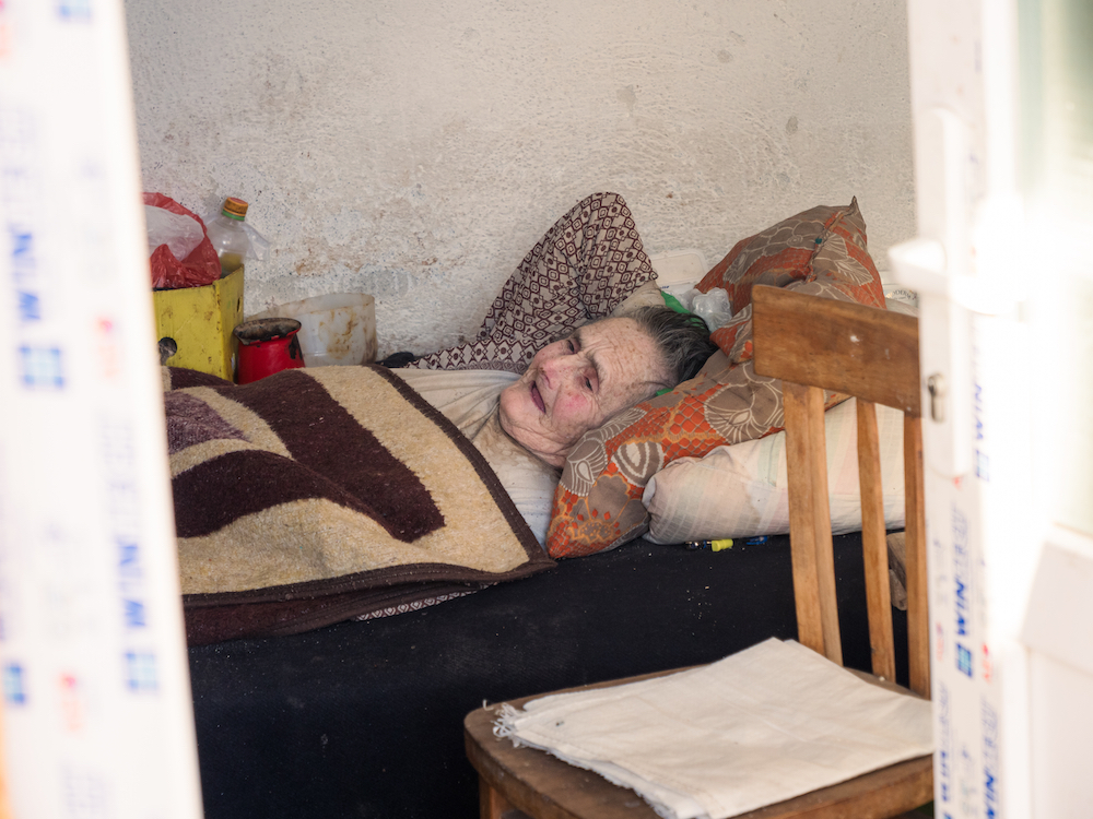 Le Père Stevo, curé de Novo Brdo qui nous guide aujourd’hui, nous regroupe autour de lui : « Ici, c’est particulièrement difficile, ce sont des gens très pauvres, ils n’ont presque rien. Nous avons pu leur installer des fenêtres au début de l’hiver : depuis des années, seuls des grands plastiques et des vieilles couvertures les séparaient du froid de dehors ». Au moment où il ouvre la porte, une odeur très forte nous agresse, malgré le vent froid. Dans la seule pièce, minuscule, de la maison, une vieille femme allongée sur un lit fait de palettes. Alitée depuis des années, elle vit avec son fils qui s’occupe d’elle comme il peut.